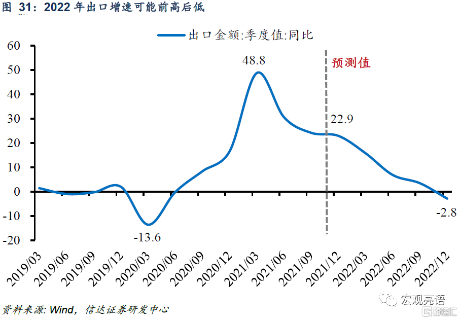 三是2022年出口增速可能前高後低,出口支撐扭轉。2020年下半年以來至2021年底,我國出口經歷了一輪波瀾壯闊的高增長時期。但2022年,包括美國、歐洲在內的全球經濟增長放緩,我國的出口前景面臨挑戰。此外,考慮到去年我國出口高景氣與海外生產能力受挫、我國出口份額上升有關,而今年海外生產能力逐漸修復,我國出口份額有小幅下降風險,這將進一步加大我國出口下行壓力,對人民幣匯率的支撐也趨於減弱。