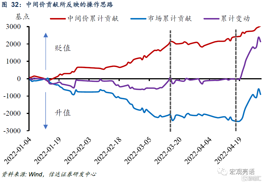 央行對於匯率的態度,是既怕人民幣快速、大幅貶值,又擔心人民幣不貶值。我們對人民幣即期匯率的變動進行分解,具體分解爲市場貢獻和中間價貢獻,可以看到,3月後半月,市場力量總體貢獻貶值,中間價力量總體貢獻升值,在貶值壓力初現的敏感關頭,反映出人民幣匯率大幅貶值和持續貶值並非合意結果。4月上半月,在貶值壓力仍然存在的背景下,中間價因素又體現出順勢貶值的特徵,顯示人民幣匯率居高不下亦並非合意結果。儘管看似矛盾,實則和諧統一。概言之,人民幣匯率小幅緩慢貶值似乎纔是對各方面最友好的結果,既有利於提高出口競爭力促進出口,又不至於引發相關金融風險。