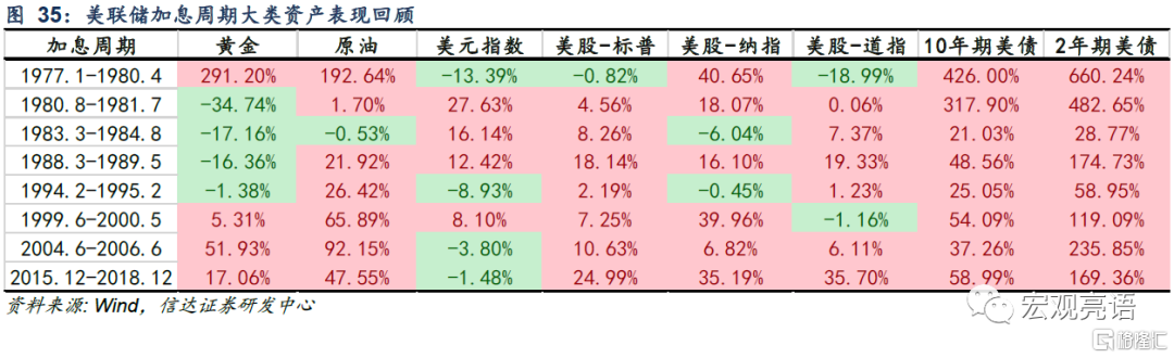 1)理論上加息提升美元資產吸引力,全球資本回流美國有助於推高美元指數,但歷史表明加息週期美元走勢分化。最近八次加息週期,美元指數強弱各半,美元指數受到美國經濟在全球中的相對位置影響,如果全球經濟同步向好,則加息無法顯著提高美元資產吸引力,此外需要注意美元指數往往在加息落地前的政策博弈階段先行上漲,在加息開始後美元升值反而減弱,這一點在聯儲越發重視預期管理的當下值得特別關注。5月加息落地,市場博弈焦點轉向美聯儲政策調整的可能性,短期內,依然強烈的加息預期和俄烏衝突所催生的避險需求將持續維繫美元強勢格局。中長期來看,“沃爾克式”加息的可能性存在,美國經濟面臨政策緊縮和迴歸潛在增速的雙重壓力,美元可能開啓震盪走勢。