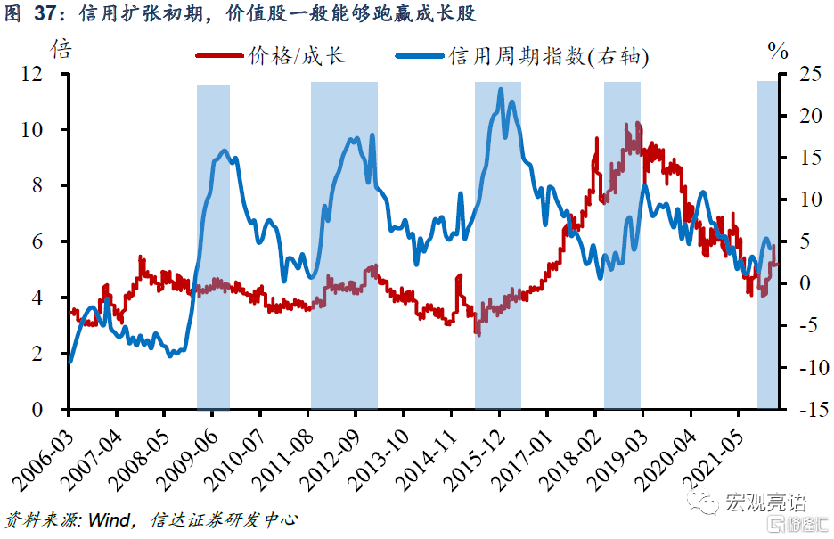 信用擴張初期,價值股一般能夠跑贏成長股。股市行情通常滯後於信用週期,而當信用開始收縮,股市的上行通常還能再維持一段時間。原因在於信用週期和經濟週期並不同步,前者向後者的傳導需要時間。根據我們構建的信用週期指數,當前處於信用擴張初期,價值股一般能夠跑贏成長股。結合2012年6月、2016年8月、2019年5月、2021年8月,指數觸底回升後的一段時間,價值板塊的勝率更高。