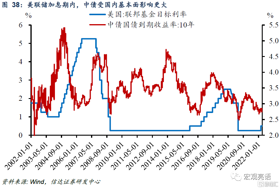 5)歷史上八次加息無一例外地推動美債走熊。基於歷史表現,10年、2年期美債收益率在加息週期內均明顯上行,這與政策利率作爲美債定價因子直接相關。當前美聯儲繼續加息的確定性強,再次加息50bp的可能性高,美聯儲開啓漸進式縮表,都對長端美債收益率形成支撐。短期來看,工資通脹螺旋升溫、油價走強或引導通脹預期進一步發酵,同時美國經濟增長動能仍存,實際利率繼續作爲支撐,上半年10年期美債利率維持在3%上下的可能性較大,高點或突破3.2%。中長期來看,通脹預期和加息預期已較爲充分,未來趨於降溫,但政策利率的擡升和縮表將繼續對長端利率形成支撐,下半年10年期美債利率或維持高位震盪。