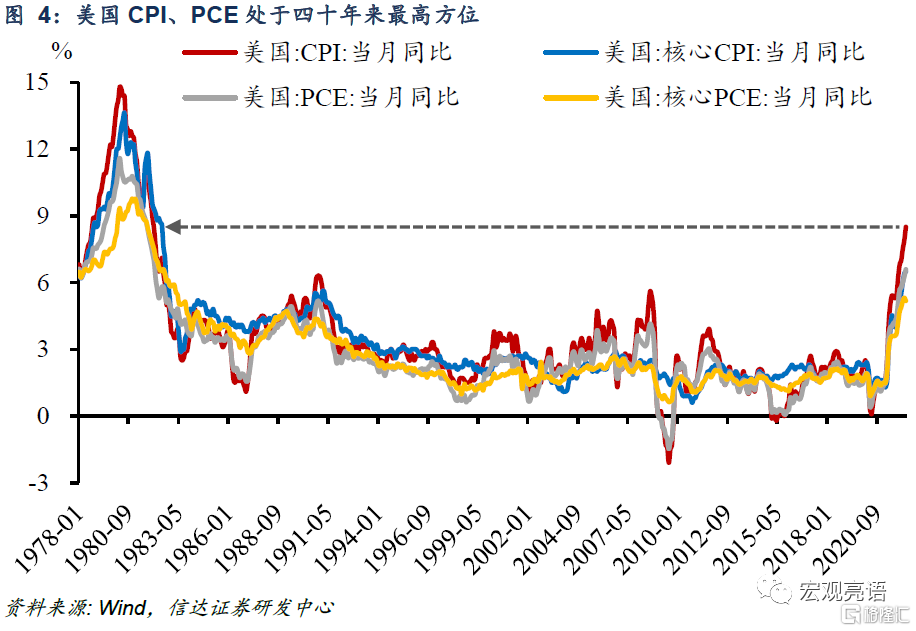 美國通脹正處於過去四十年來的最高方位。從CPI看,美國3月份CPI同比錄得8.5%,上一次美國CPI達到這麼高的位置還要回溯到1981年。從核心CPI看,美國3月核心CPI同比6.5%,同樣創下四十年來的新高。即便看美聯儲重點關注的PCE和核心PCE數據,結論也並無差別,美國3月份PCE同比爲6.6%,也創下四十年來的新高,核心PCE同比爲5.2%,僅次於2月份的5.3%。四十年前,面對石油危機之後美國經濟出現的高通脹現象,美聯儲主席沃爾克選擇了鐵腕治理,並以此最終彪炳史冊。