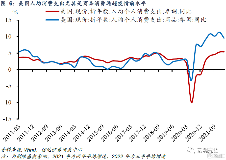 個人消費和私人投資等經濟增長的主要動能依舊強勁。1)個人消費佔美國GDP的比例接近70%,對於美國經濟有至關重要的作用,消費擴張意味着經濟仍具韌性。2022Q1個人消費支出的環比拉動率提升,特別是服務消費持續修復,反映出美國逐步解封所產生的積極影響,居民消費將持續從商品消費轉向服務消費,進而推動個人消費增長。2)私人投資拉動Q1經濟增長,其中固定投資明顯改善,其他分項多數呈現爲正向貢獻。但私人存貨變化再度轉負,環比拖累0.84%,較去年Q4環比拉動5.32%出現大幅下降。批發和零售商的減少導致了此次存貨投資變動下降,究其原因,或與芯片等原材料供給約束有關,反映出供應鏈仍待修復。