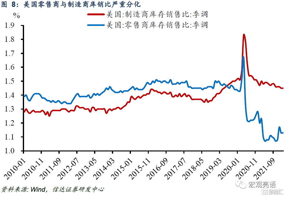 其次是疫情下美國遲遲得不到解決的供應鏈短缺,突出表現是運輸阻滯。客觀來說,美國產能利用率在後疫情時代經歷了一個明顯的修復過程,2021年初的時候已經回到並超過了疫情的水平。但問題在於,在需求創下歷史新高的同時,產能利用率卻遲遲迴不到之前的高點,一直到今年3月份製造業產能利用率才超越上輪高點。比產能修復問題更嚴重的是運輸阻滯問題。我們看美國零售商的庫存銷售比,目前只有1.1,處於1992年有數據以來的最低位,比疫情前的1.4低了20%多,而製造商庫銷比高達1.45,處於歷史高位區間,反映產成品從製造商運輸到零售商存在阻滯。