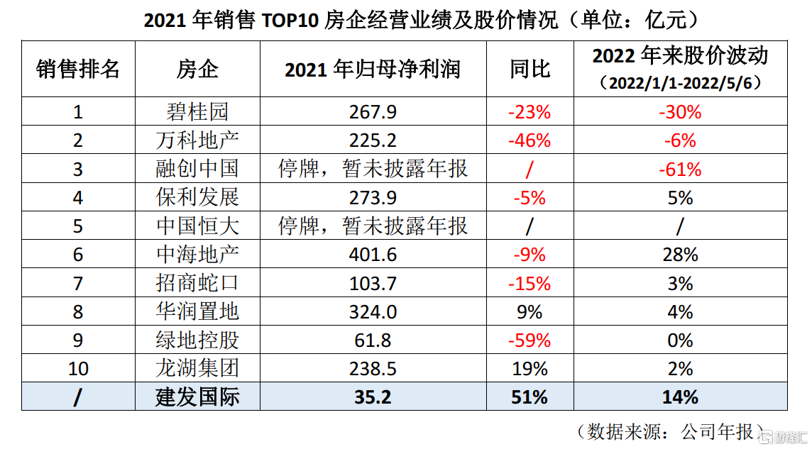 根據其業績公告,2021年建發國際實現歸母淨利潤約35.2億元,同比增幅達51%,大幅超越同業平均;同時,股價表現堪稱亮眼,2022年初至今股價漲幅達14%,大幅跑贏恆生指數(-14%,憑藉優異的成績單獲得資本市場認可。