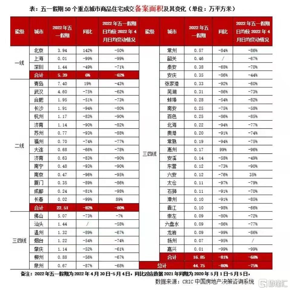 剛剛過去的五一小長假中,受疫情等多因素影響,樓市整體延續了下行趨勢,環比跌幅加大。據克爾瑞統計,2022年五一期間(4月30日-5月4日),50個重點監測城市累計成交44.75萬平方米,同比下降80%,日均成交量較2022年4月日均降幅爲75%。