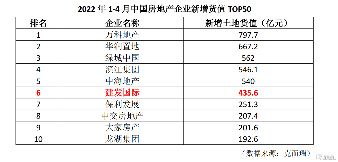 2022年來,在行業土拍市場頹靡的環境下,建發國際在拿地方面卻保持穩健擴張趨勢。根據中指研究院數據顯示,2022年1-4月建發國際拿地貨值爲435.6億元,位列行業第六,拿地覆蓋北京、杭州、寧波、福州、廈門等核心一二線,以及莆田、寧德等強三線城市,佈局核心城市的核心區域地段,預計項目未來銷售去化具備優勢。