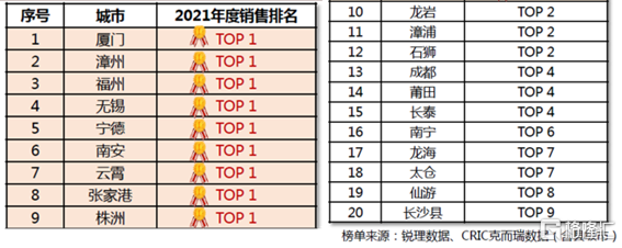 建發國際秉承深耕策略,在重點城市市佔率呈現不斷提升趨勢。截至2021年末,建發國際已進入70餘城市,單城市銷售額逐年增長;根據克而瑞統計數據,公司已有20個城市銷售排名進入當地房企銷售榜單TOP10。