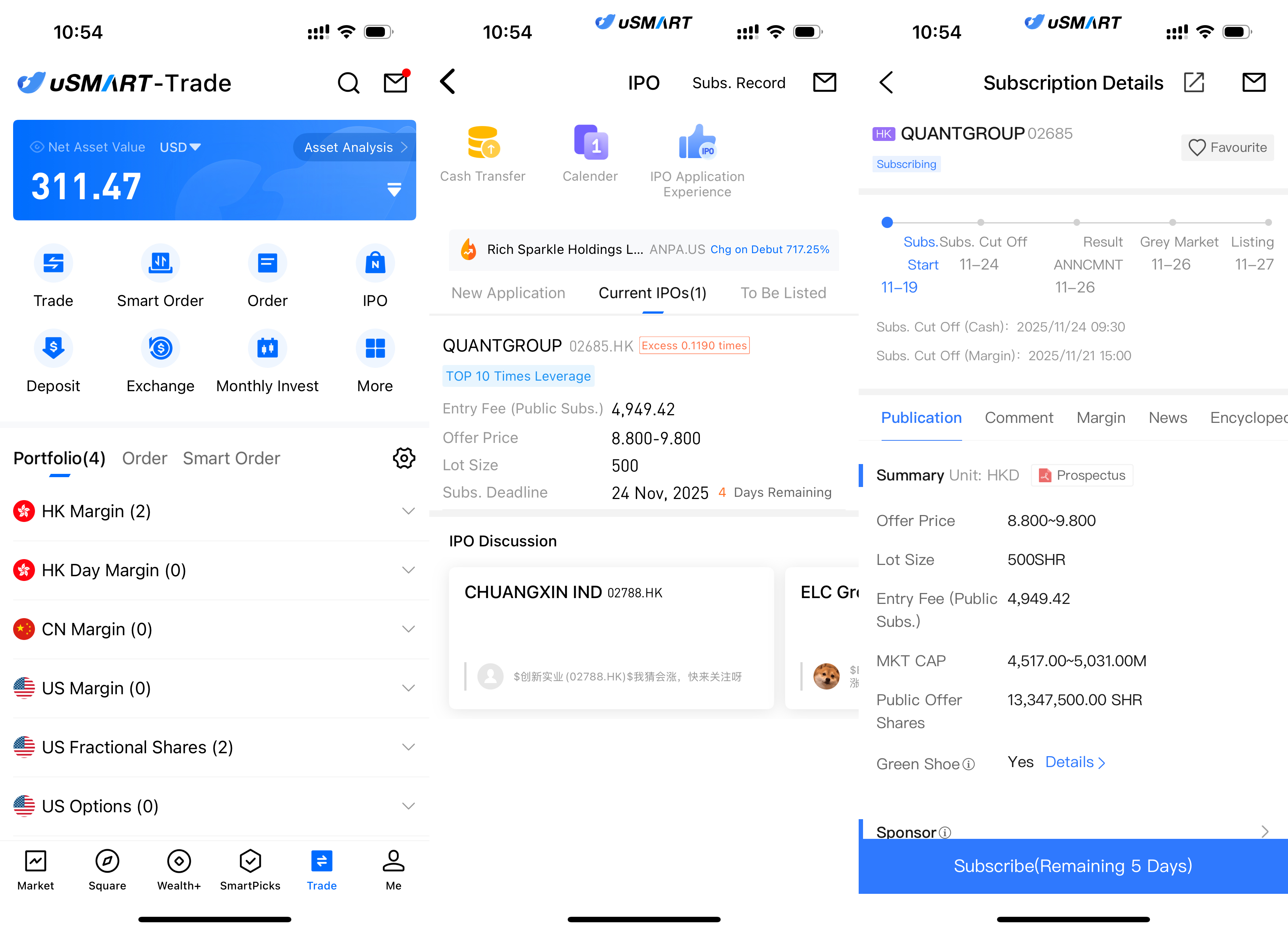 The uSMART HK App features an IPO Centre with exclusive perks, allowing clients to subscribe instantly to public offerings. After logging into the app, tap "Trade" at the bottom-right, go to "IPO Subscription," select Quantgroup, tap "Public Offer," enter your subscription quantity, and submit your order.