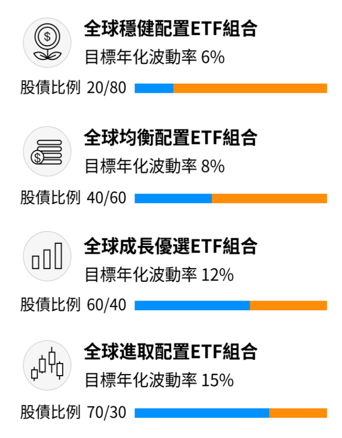 根據投資者的投資偏好和投資目標,uSMART按照不同的股債比例將ETF分為不同的組合,如全球穩健配置組合、全球均衡配置ETF組合、全球成長優選ETF組合、全球進取配置ETF組合。 根據投資者的投資偏好和投資目標,uSMART按照不同的股債比例將ETF分為不同的組合,如全球穩健配置組合、全球均衡配置ETF組合、全球成長優選ETF組合、全球進取配置ETF組合。