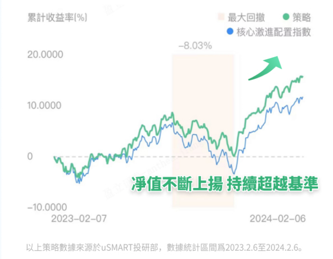 資產配置全球進取配置ETF基金組合業績走出亮眼表現,近一年收益超18.61%,超越基準(核心激進配置指數)約4%,力爭獲取長期穩健收益。