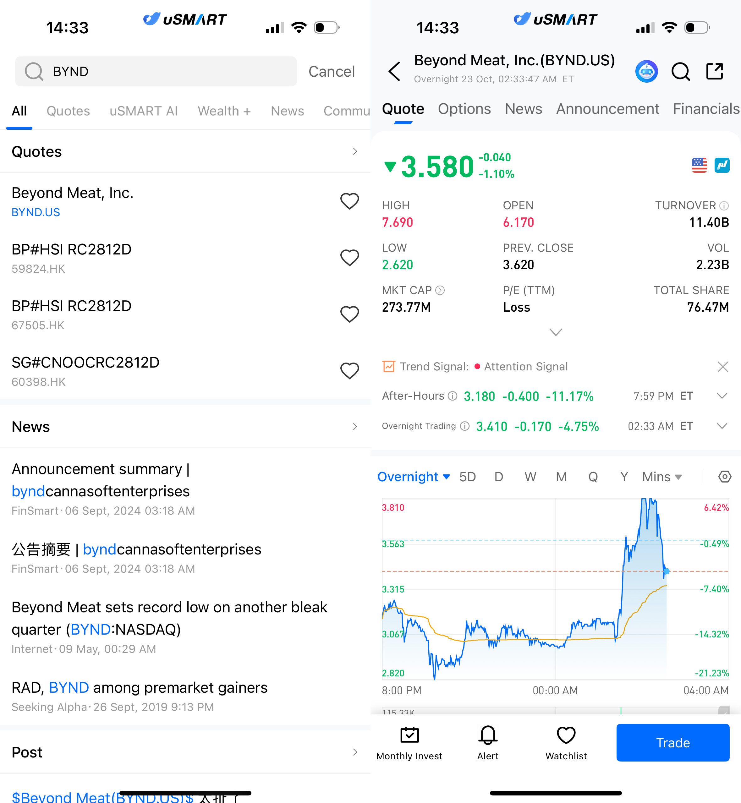 After logging into the uSMART HK app, click on “Search” at the top right of the page, input the stock code (BYND.US) to access the details page and view transaction details and historical trends. Then click the “Trade” button at the bottom right, select the “Buy/Sell” option, fill in the transaction conditions, and submit your order.