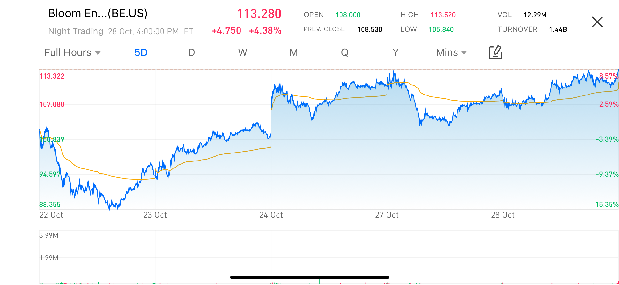 Fuel cell company Bloom Energy (BE.US) saw its stock continue to rise after releasing its Q3 2025 earnings report. On October 28, the stock closed at USD 113.28, up 4.38%, with a trading volume of approximately USD 1.44 billion. Over the past five trading days, the stock price rebounded from a low of around USD 88 to over USD 113, marking a cumulative increase of more than 28%, reaching a new high in recent months, signaling a notable recovery in market sentiment.