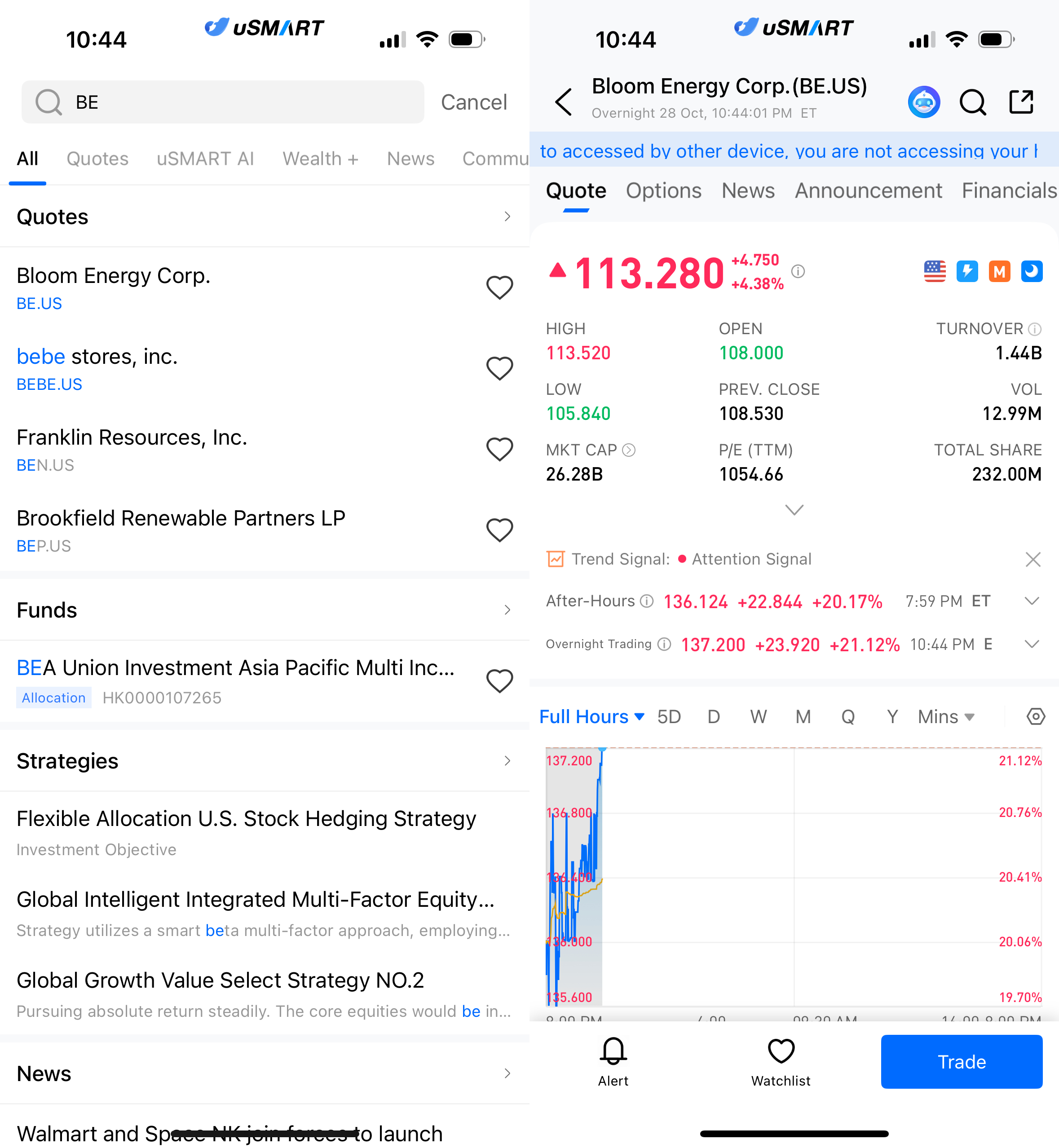 After logging into the uSMART HK App, tap the search icon in the top-right corner, enter the stock code (BE.US), and open the details page to view trading and historical information. Then tap “Trade” at the bottom-right, select the order type, enter your trading conditions, and submit your order.