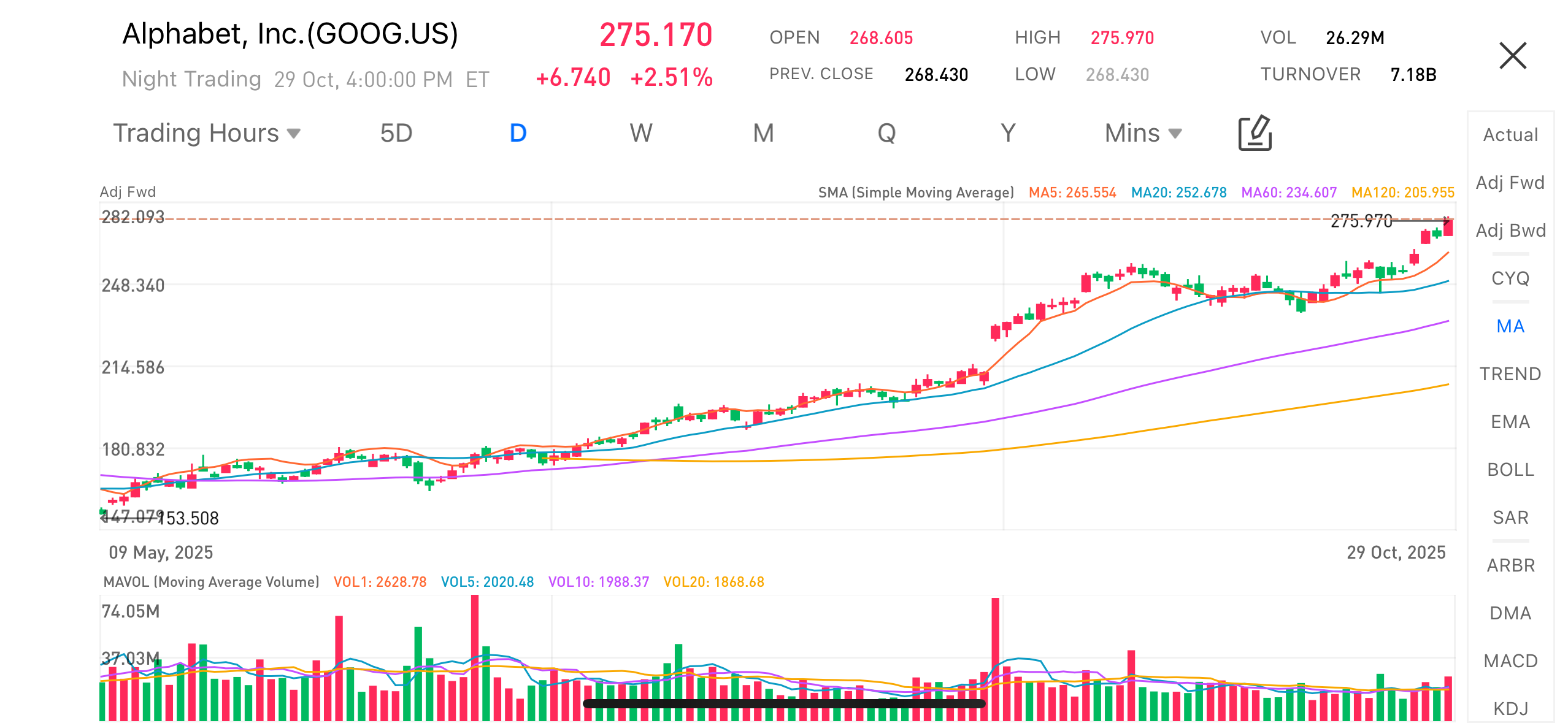 October 29, 2025 – Alphabet (GOOG.US), the parent company of Google, reported its Q3 2025 earnings, revealing impressive growth across various business segments, particularly in cloud computing and advertising. This strong performance led to record-high overall results. Following the earnings release, Alphabet’s stock surged in after-hours trading, climbing by 2.51% to close at $275.17.