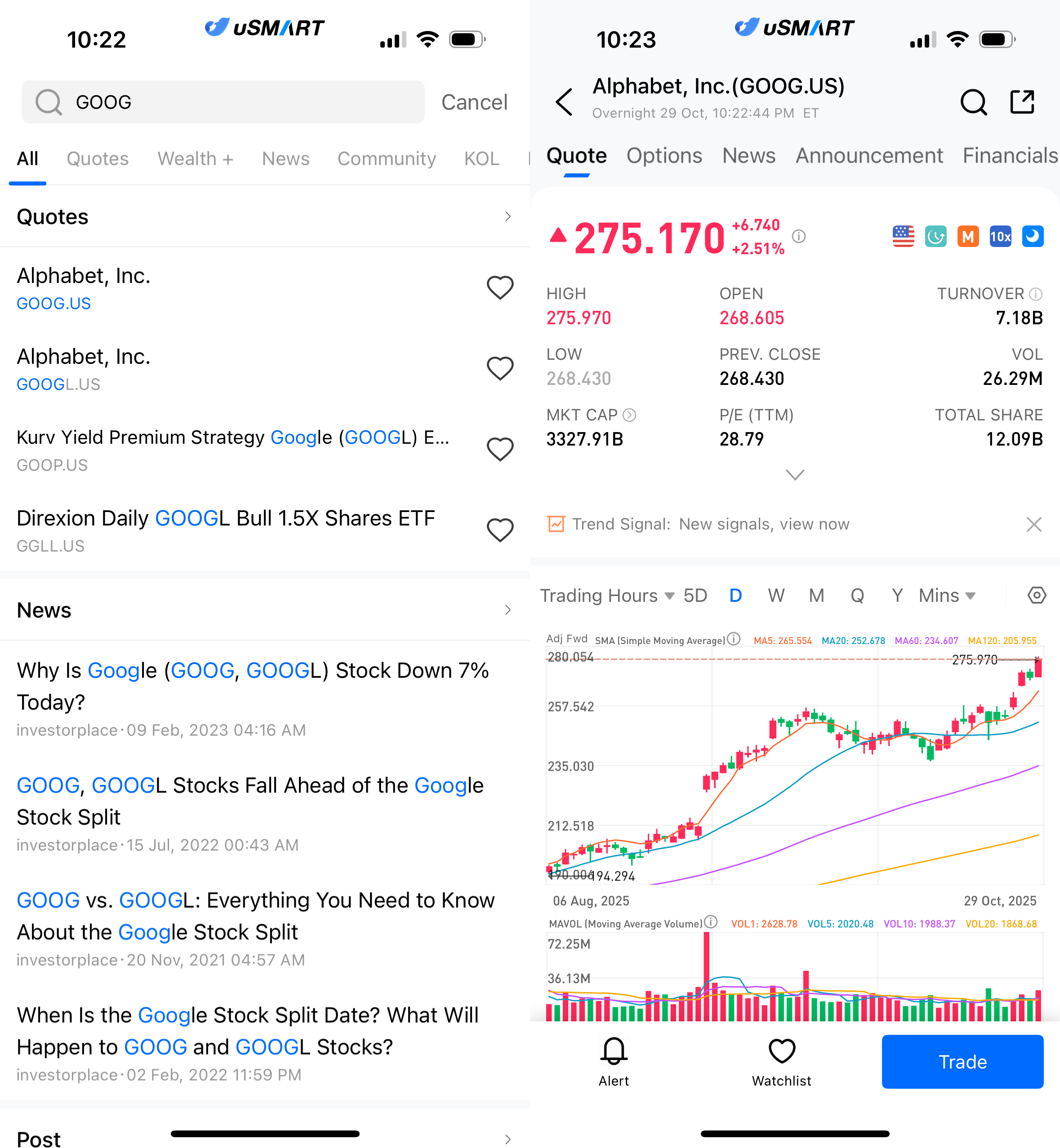 After logging into the uSMART HK App, tap the search icon in the top-right corner, enter the stock code (GOOG.US), and open the details page to view trading and historical information. Then tap “Trade” at the bottom-right, select the order type, enter your trading conditions, and submit your order.