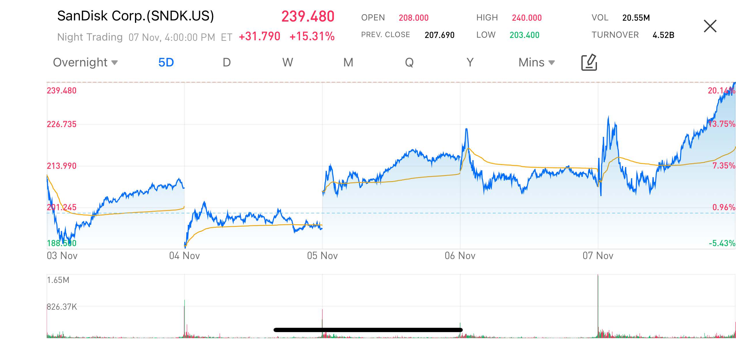 Following the price increase announcement, SanDisk’s stock reached an all-time high of $239.48 on November 7, 2025, closing up $31.79, or 15.31%, from the previous trading day. The market is optimistic about the company’s earnings performance and future growth prospects.