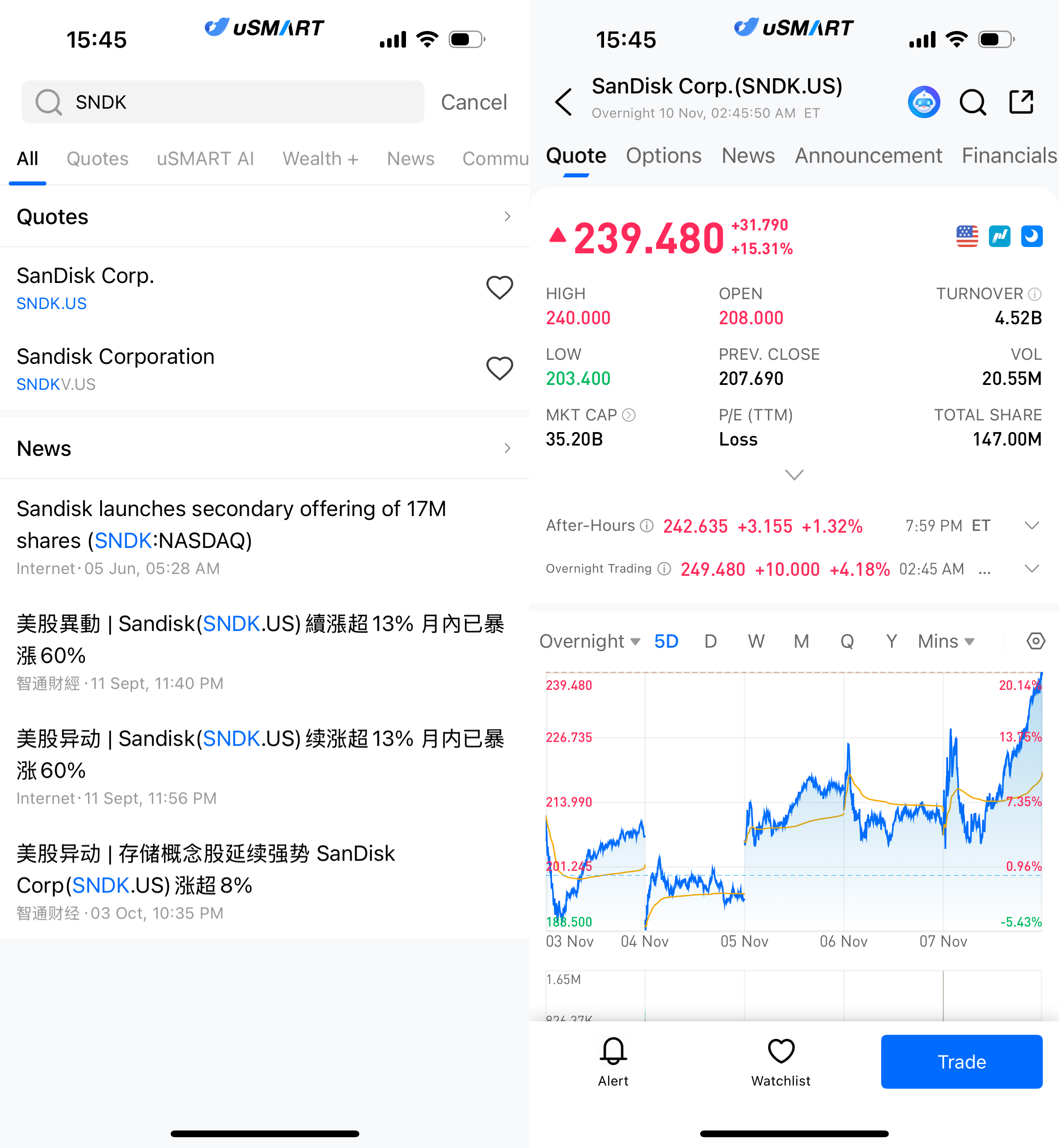 After logging into the uSMART HK App, tap the search icon in the top-right corner, enter the stock code (SNDK.US), and open the details page to view trading and historical information. Then tap “Trade” at the bottom-right, select the order type, enter your trading conditions, and submit your order.