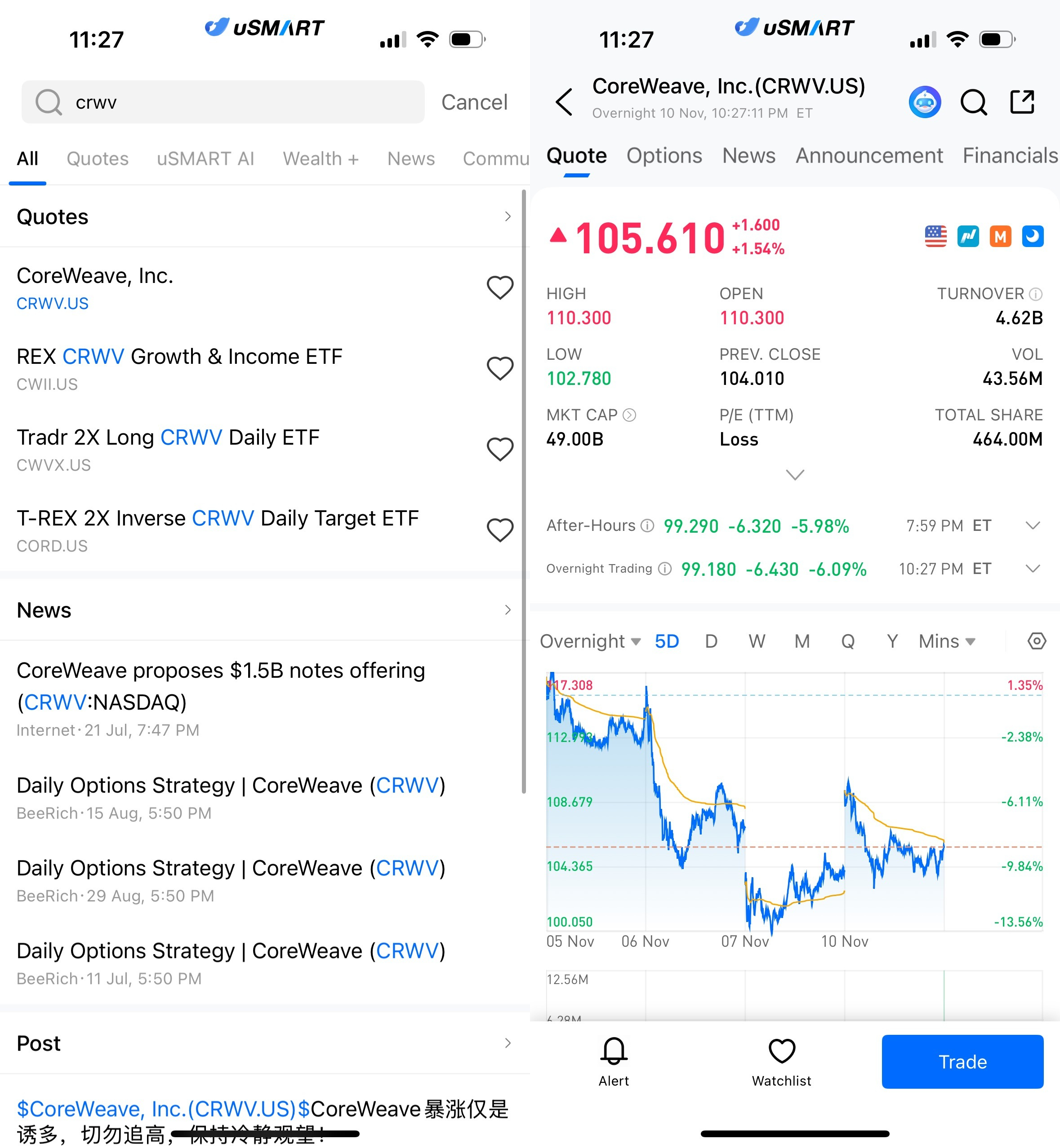 After logging into the uSMART HK App, tap the search icon in the top-right corner, enter the stock code (CRWV.US), and open the details page to view trading and historical information. Then tap “Trade” at the bottom-right, select the order type, enter your trading conditions, and submit your order.