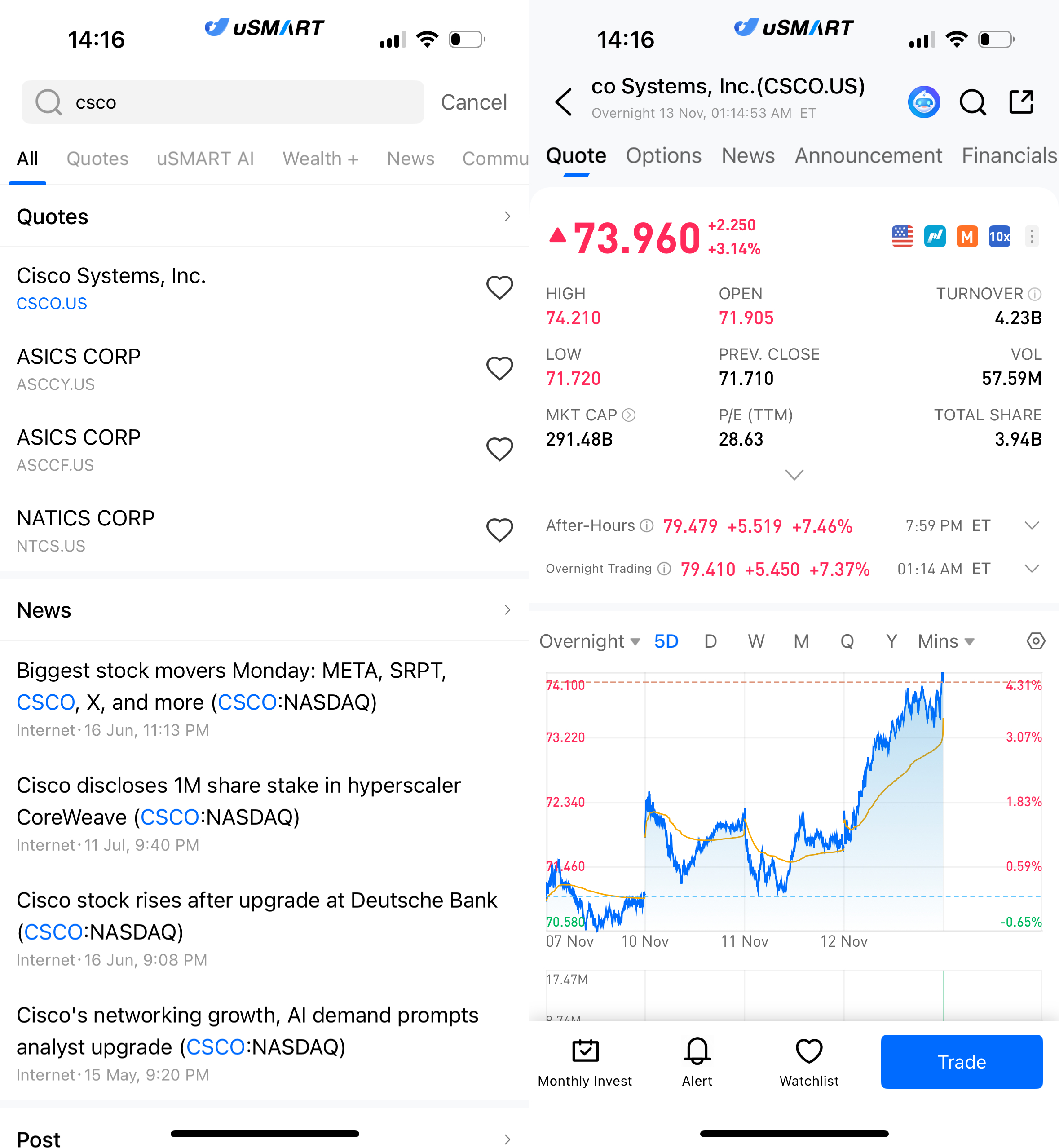 After logging into the uSMART HK app, click the “Search” button in the top-right corner of the page, enter the ticker code (CSCO.US), and navigate to the details page to view transaction details and historical trends. Click the “Trade” button in the bottom-right corner, select the trade type, and submit your order after filling in the transaction conditions.