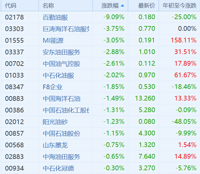 此外,百勤油服跌9%,巨涛海洋油服和MI能源跌超3%,安东油服、中国油气控股和中石化油服跌超2%。