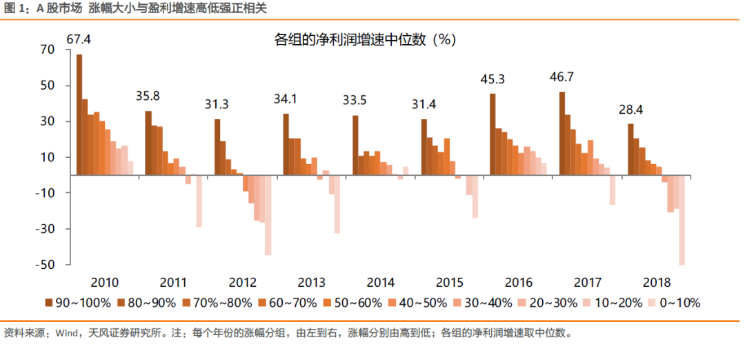 全市场看,短期涨幅大小与增速高低强正相关。如下图,将个股年度涨幅分组,涨幅TOP10%的分组其净利润增速也是最高的,且涨幅越低的分组,其净利润增速也相应越低。若我们以季度间的盈利变化作为择股的核心思路,是可以穿越周期的,因为市场的短期涨跌更依赖于短期的业绩变化,详细可参考ROE选股模型系列报告。