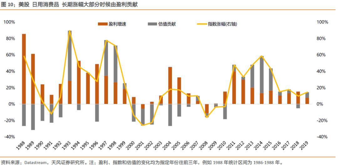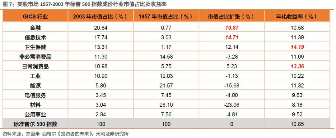 另一个证据是,1957-2003年标普500成份股中表现最佳的20家公司,有11家消费品牌公司和6家生物医药,合占85%份额。(资料来自《投资者的未来》)