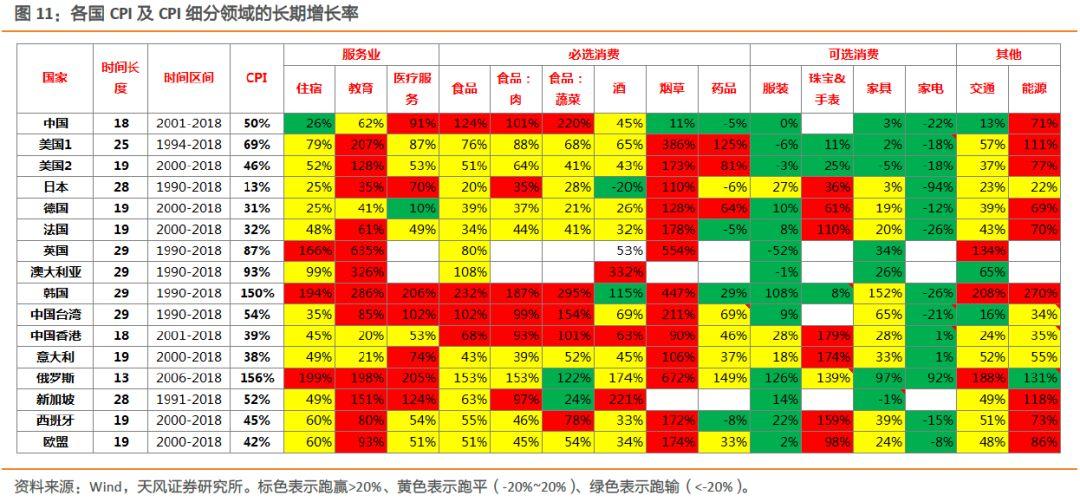 另一方面,可通过不同类型消费行业的长期CPI水平来确定永续增长率。消费品行业在竞争格局稳定后,盈利的增长主要体现在价格的增长上。从各国的CPI及CPI细分领域的长期增长率,并非所有的消费行业CPI都能跑赢整体CPI,一般来说,必需消费品长期增速高于整体CPI,而可选消费品的长期增速低于整体CPI。这与美股市场上必需消费品长期跑赢可选消费品的逻辑是一致的,必需消费品容易有品牌和客户忠诚度积累,且若有行业集中趋势的行业,则增长率还能有加成。因此,长期来说,选择涨价能跑赢CPI的行业更好,而这类行业主要集中在必需消费品行业。