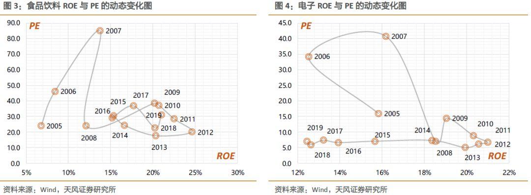 初创行业或成长行业通常ROE和估值的波动都较大,高估值面临的更多是随之而来的杀估值困境。对于代表未来趋势的新兴产业,市场通常会给予乐观的预期,但能最终经历时间考验并用盈利“说话”的行业并不多。随着时间推移,很多成长行业都面临杀估值的困境。成长阶段的高估值,比如06-07年的银行股(35-40倍PE)、15-16年的电子股(65-80倍PE),甚至是09-11年的食品饮料(30-40倍PE),之后都面临着较长时间赚利润不赚股价的杀估值阶段。