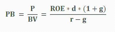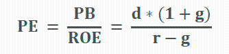 另一方面,可持续增长率(不增发新股但可增加债务)的极限速度是由ROE和股利分配政策决定的,以期初权益计算:可持续增长率g=ROE*(1-d)。这就意味着,不管是PE、还是PB的定价模型,都由ROE和g两个变量所决定。
