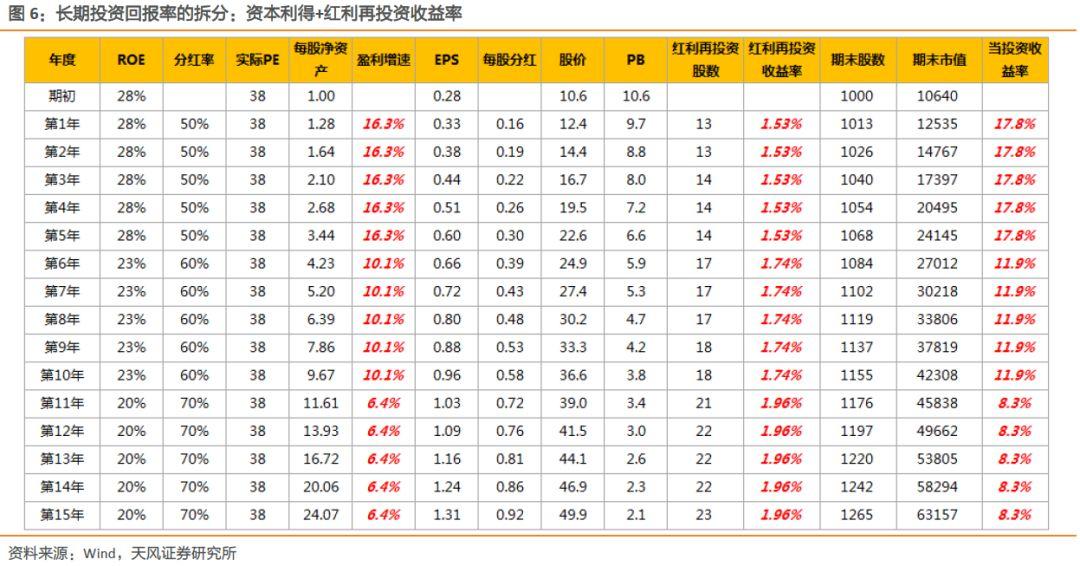 具体来说,资本市场的投资回报率来自两部分:资本得利和股利再投资收益,前者取决于盈利增速或ROE,后者取决于分红比例。我们以上文的情形一为例,假设以38倍价格买入,且未来15年都维持38倍的估值水平,则15年的投资回报率为494%,其中369%来自资本得利(即股价上涨),125%来自红利再投资收益率,即有四分之一来自红利再投资收益率。但事实上,随着盈利水平的回落,未来的估值水平很难维持在38倍的水平,资本得利要低于模型测算的结果,也就是说红利再投资收益率的占比要更高。