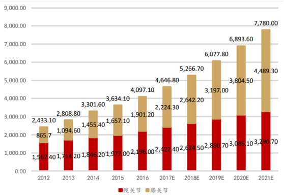细分来看,髋关节2016年市场为21.96亿元,并预计2016-2021年复合增长8.4%;膝关节2016年市场规模为19.01亿元,并预计2016-2021E年复合增长18.7%,膝关节的增速处于快速发展的阶段。