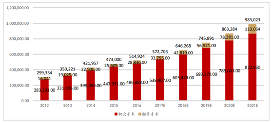 关节寿命一般从10-25年不等,和选用的材料、病人的体重以及和病人的产品使用磨损等因素相关。骨关节产品,一般会分为初次植入和再次翻修。据弗若斯特沙利文预计,中国髋及膝关节置换植入物翻修手术总数占骨关节置换植入物手术总数的百分比将由2016年的5.6%增加至2021年的11.2%。