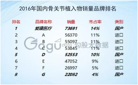 根据弗若斯特沙利文统计数据,就骨关节使用数量而言,2016年我国前8的品牌,3个国产5个进口,前8使用量占整体市场的75.2%,国内以爱康和春立为首。