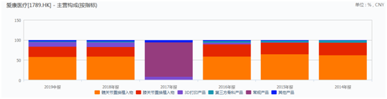 目前,公司的主营业务分为3大板块,分别是髋关节置换植入物、膝关节置换植入物、3D打印产品。据2019年中报可知,这三类业务占总营收的比例为58.36%、25.32%、11.71%。