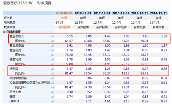 2019年上半年,爱康医疗总营收5.15亿港元,同比增长64.57%;净利润为1.47亿港元,同比增长81.47%。过去四年(2015-2018年),业绩同样亮眼,营收同比增幅分别为39.01%、31.26%、38.02%、60.68%;净利润同比增幅分别为25.49%、19.13%、36.27%、37.54%。