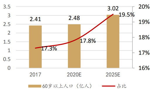 首先要明确的是,中国进入老龄化社会的趋势不可逆转。据前瞻产业研究院,2017年60岁以上的人口为2.41亿,占比17.3%,预计到了2025年,60岁以上的人口超过3亿,占比19.5%。并且,人的寿命越来越长,从1982年的67.8岁,到2015年的76.34岁。
