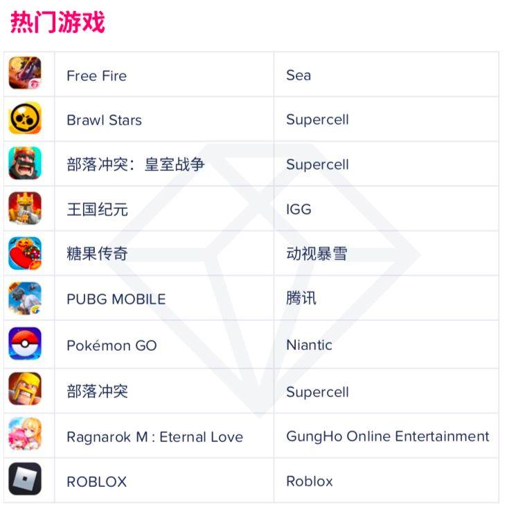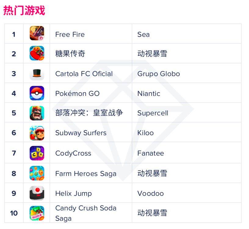 根据 app annie 最新发布的报告显示,按巴西用户支出排名,2019年跻身前十名的领先游戏公司中,有3家来自中国的公司,分别是 IGG 、腾讯和游族。