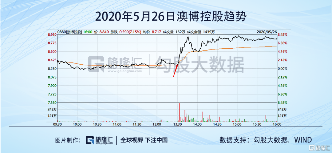 令投资者意外的是,上述消息传出后,博彩股快速拉升,其中澳博是最明显的,从涨1个点左右拉到了最高8个多点,其次是新濠国际,然后是美高梅,其它三家也有拉升,但以何家博彩股最为明显。