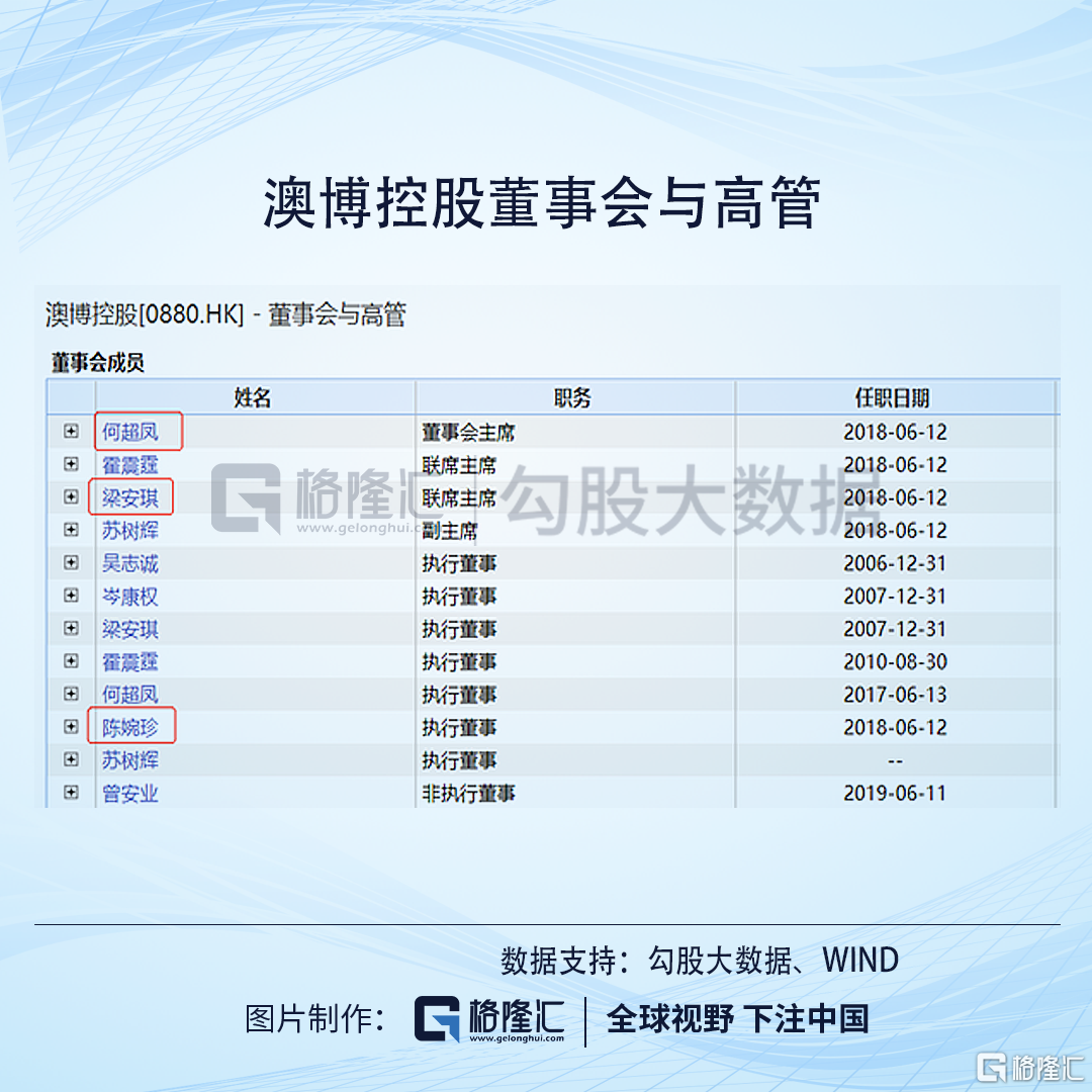 请看董事会席位安排上,董事会主席是何超凤,又是二房的。除了主席外,还有两位联席主席,一位是霍震霆,这位是来自霍英乐家族。何鸿燊能战胜老赌王傅家,霍英东功不可没,霍家有股份,有董事会席位,不奇怪。