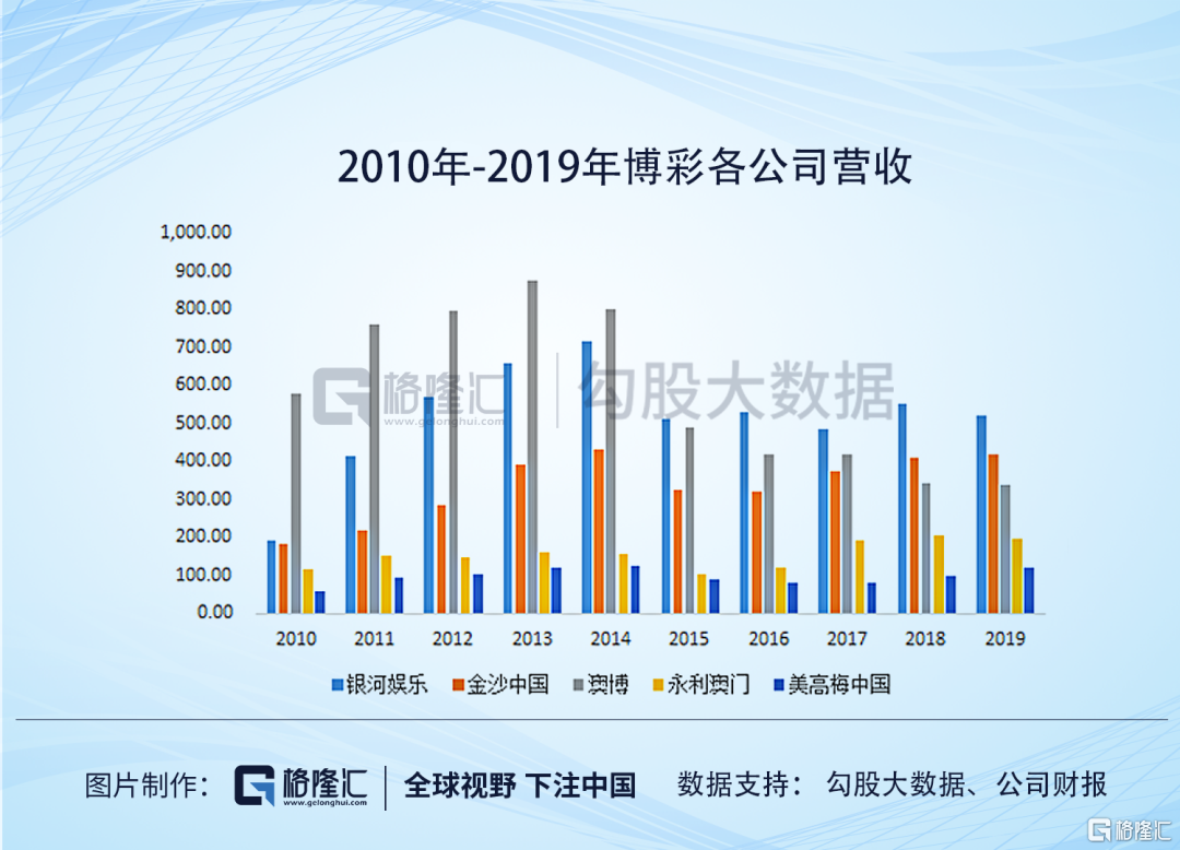股价表现不佳,主要是业绩不给力。10年前,2010年,澳博控股营收577亿,其它四家(银河、金沙、永利,美高梅)加起来,营收也只有550亿,不及一个澳博,可见澳博当年的盛况。(注:下图2017年银河娱乐的营收有重列)