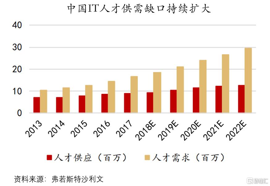 就IT教育行业而言,目前我国IT行业每年新增人才需求超300万人,但大学、大中专毕业生规模仅百万出头,每年存在着超200万人的供需差。根据教育部测算,到2025年我国仅IT人才供需缺口就高达950万。