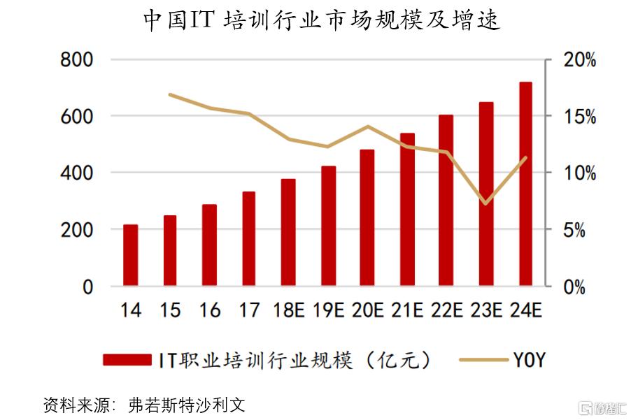 根据弗若斯特沙利文报告,我国IT类职业教育培训市场规模有望从2019年的421亿元增长至2024年的720亿元,CAGR达11.3%。
