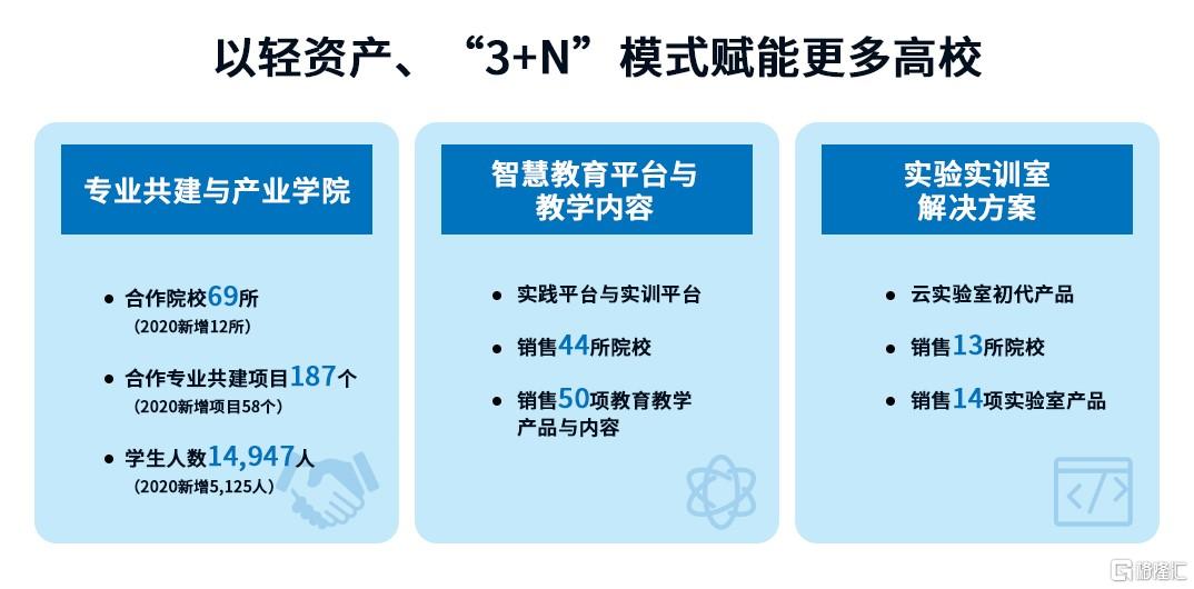 在教育资源与数字工场方面,公司的“3+N”模式赋能更多高校获得高度认同,深度专业共建合作院校数量也在持续扩大,2020年教育资源输出业务覆盖学生数达14947人,相当于一个中等规模的高校。截至2020年底,按使用IT服务学校数量统计,公司在中国IT增值教育服务提供商中已位列第二。