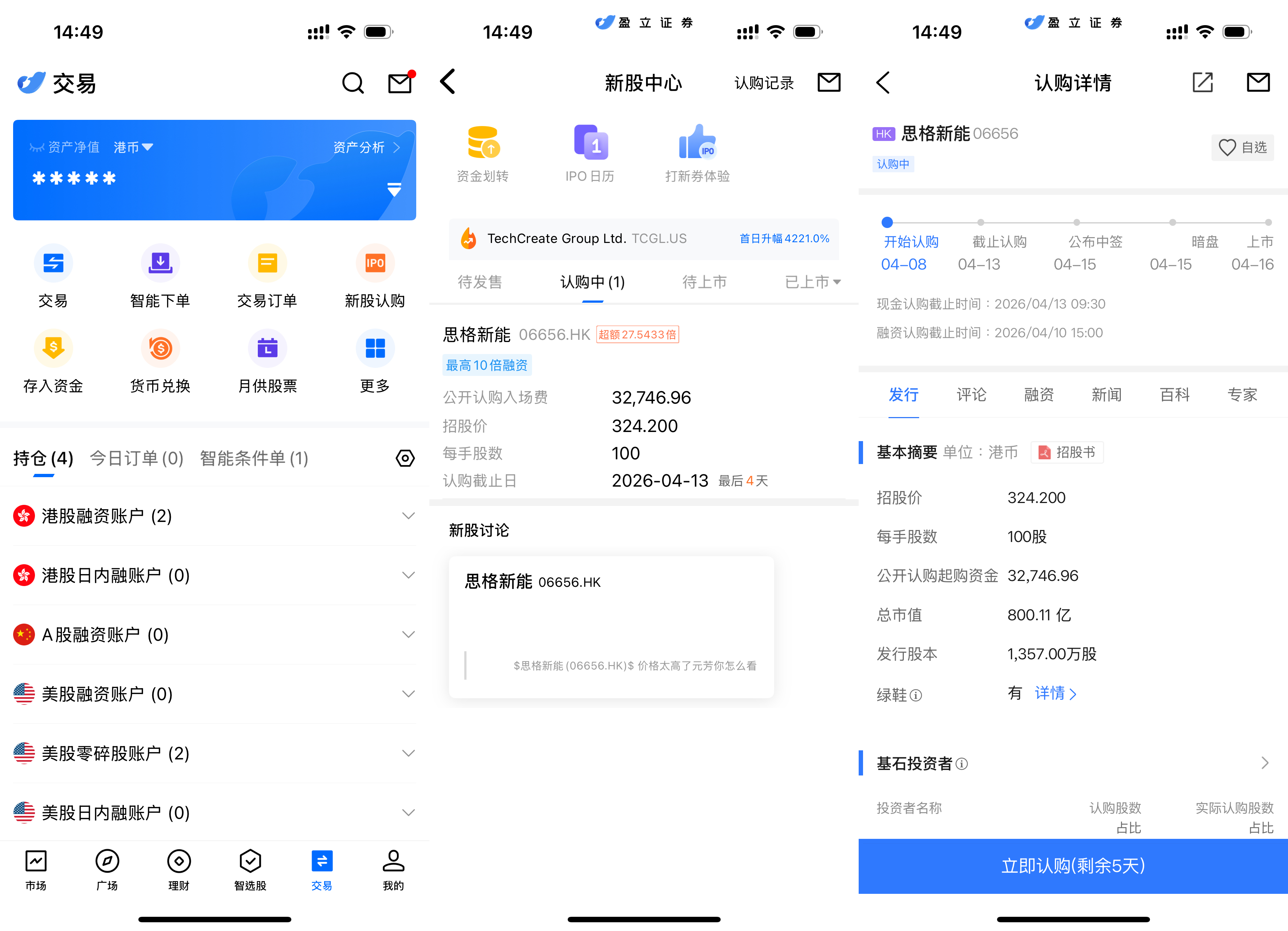 uSMART HK App 设有 IPO 中心,提供独家优惠,客户可在 App 即时认购公开发售之新股。登入 uSMART HK App 后,点选右下角「交易」,进入「新股认购」,选择思格新能源后点击「公开认购」,填写认购数量并提交订单即可。