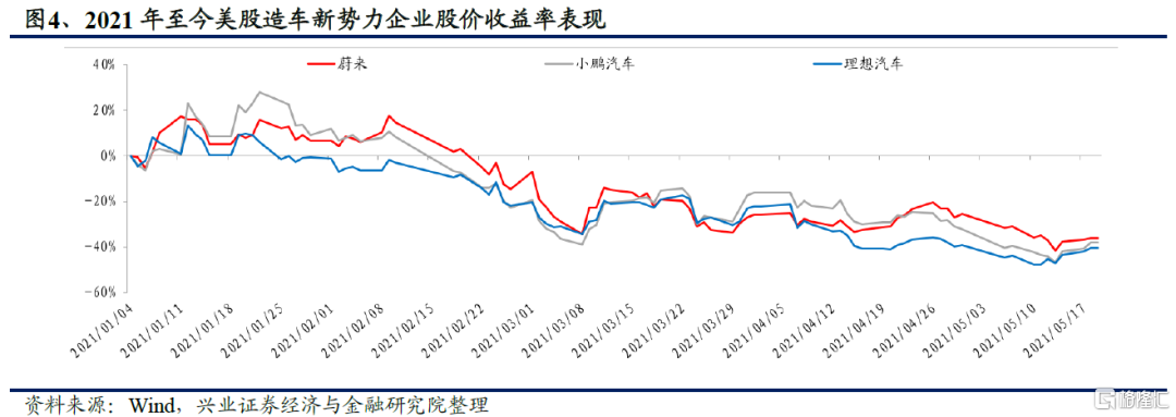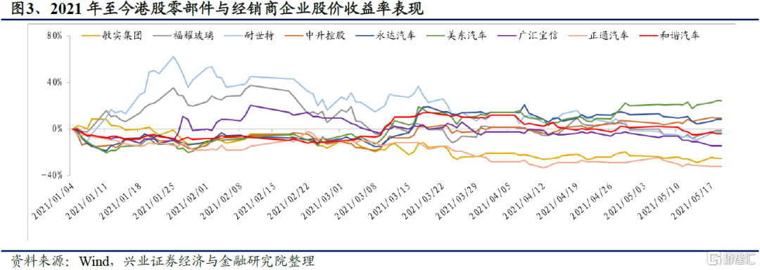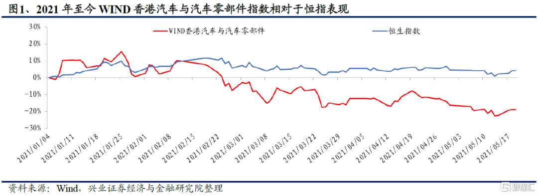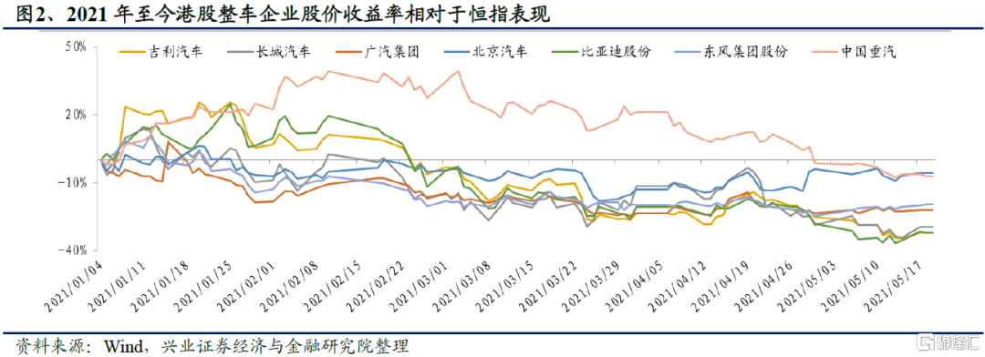2021年初至今,汽车行业受芯片短缺及原材料涨价影响,板块整体承压,Wind香港汽车与汽车零部件指数收益率低于恒生指数。年初至5月20日,Wind香港汽车与汽车零部件指数收益率为-19.0%,同期恒生指数收益率为4.1%。板块整体表现自二月开始弱于恒生指数,主要是受到芯片短缺带来的整车厂产能削减以及原材料涨价带来的成本压力双重影响,行业产销及盈利能力恢复不及预期。