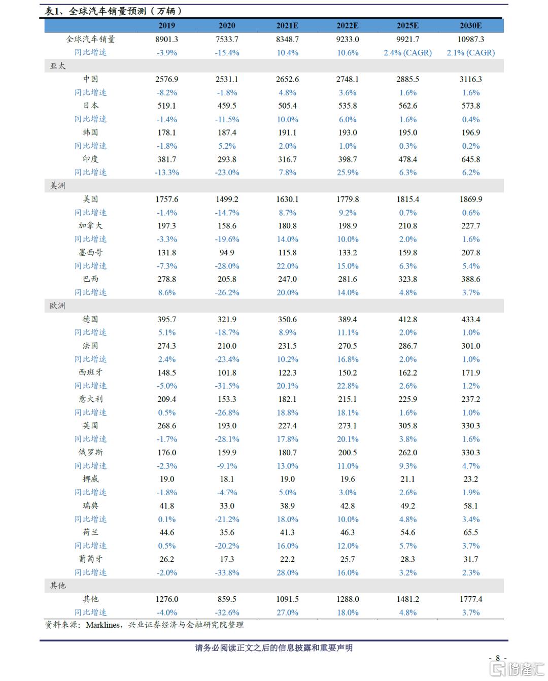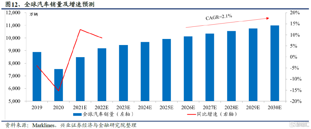 我们维持年初2021-2022年全球汽车行业将迎来恢复性增长预期,考虑到芯片短缺影响,分别下调2021年增速及上调2022年增速至10.4%和10.6%。当前,连续三年下滑导致当前我国汽车销量基数已经很低,汽车消费政策不断出台,2021年我国汽车销量有望迎来正增长,预计增速在5%左右。此外,2020年伴随疫苗逐步推广以及海外疫情得到缓解,欧美汽车行业有望快速恢复。从目前的情况来看,美国及欧洲主要国家均有望在2021-2022年实现正增长。综合来看,我们预计全球汽车销量2021年有望同比增长10.4%,2022年有望同比增长10.6%。2023-2030全球汽车销量或将进入低速增长期,预计2023-2025销量CAGR约为2.4%,2026-2020销量CAGR约为2.1%。