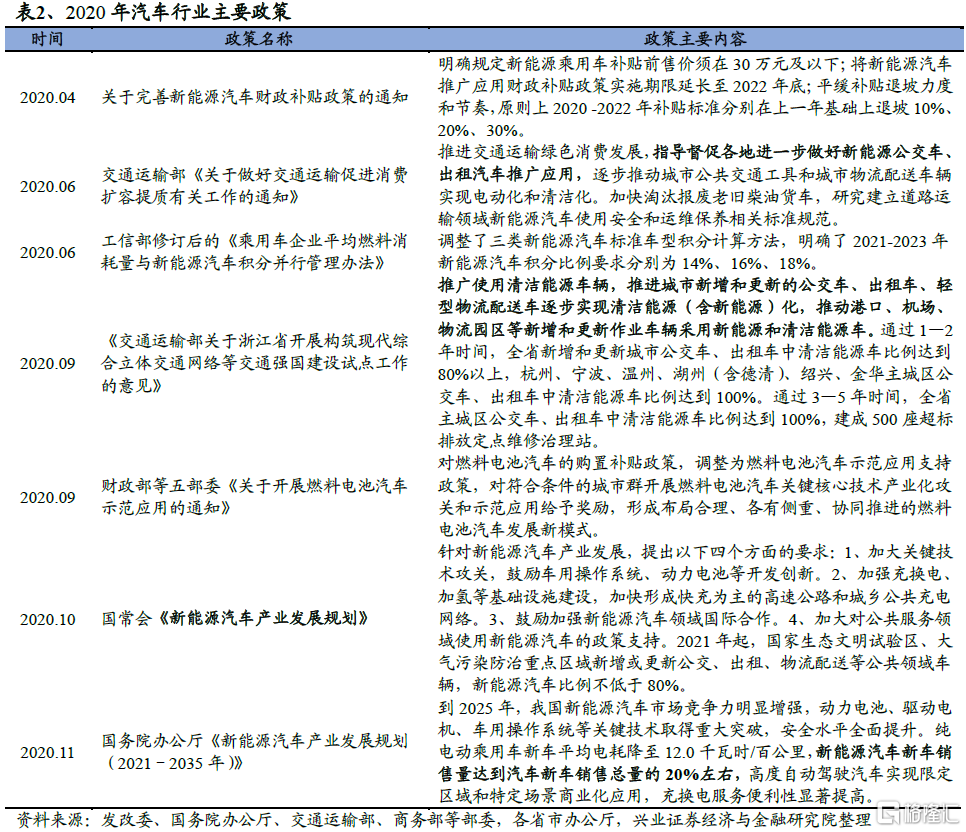 新能源进程加快,预计2020年新能源车销量占比达到20%。2020年4月,财政部、工业和信息化部、科技部及发展改革委发布了《关于完善新能源汽车推广应用财政补贴政策的通知》,提出延长补贴期限、平缓补贴退坡力度和节奏等政策。6月,工信部发布了修订后的《乘用车企业平均燃料消耗量与新能源汽车积分并行管理办法》,调整了三类新能源汽车标准车型积分计算方法,明确了2021-2023年新能源汽车积分比例要求分别为14%、16%、18%。11月,国务院办公厅正式发布了《新能源汽车产业发展规划(2021-2035年)》。《规划》提出,到2025年,我国新能源汽车新车销售量达到汽车新车销售总量的20%左右。