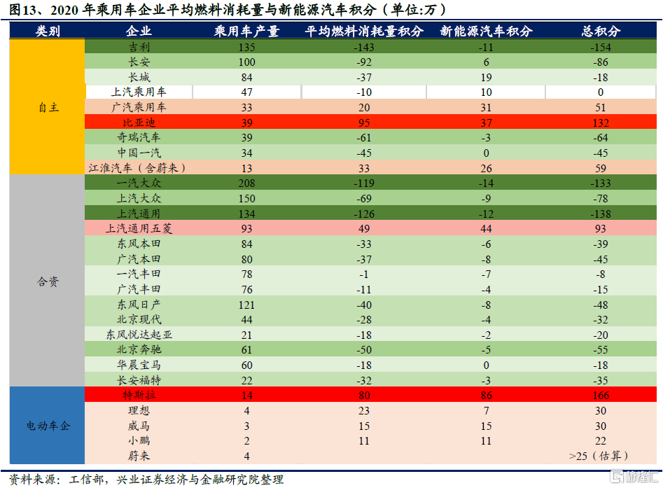 主流车企双积分缺口普遍较大,发展新能源汽车刻不容缓。2021年4月,工信部公示了《2020年乘用车企业平均燃料消耗量与新能源汽车积分执行情况年度报吿》。从企业平均油耗水平来看,2020年新能源积分和传统燃油车油耗压力较大,新能源积分高于目标值327万分,传统车油耗达到目标值的111%。传统车企油耗积分压力较大,包括上汽通用、一汽大众、上汽大众等合资车企以及吉利汽车、长安汽车、奇瑞汽车等自主车企。根据当前市场调研,当前双积分单价已涨至3000元左右每分,购买双积分对于车企利润有极大影响。发展新能源汽车有利于同时提升新能源汽车积分和平均燃料消耗积分,双积分压力较强的自主品牌和合资品牌发展新能源汽车刻不容缓,新能源汽车市场将进一步加速增长。