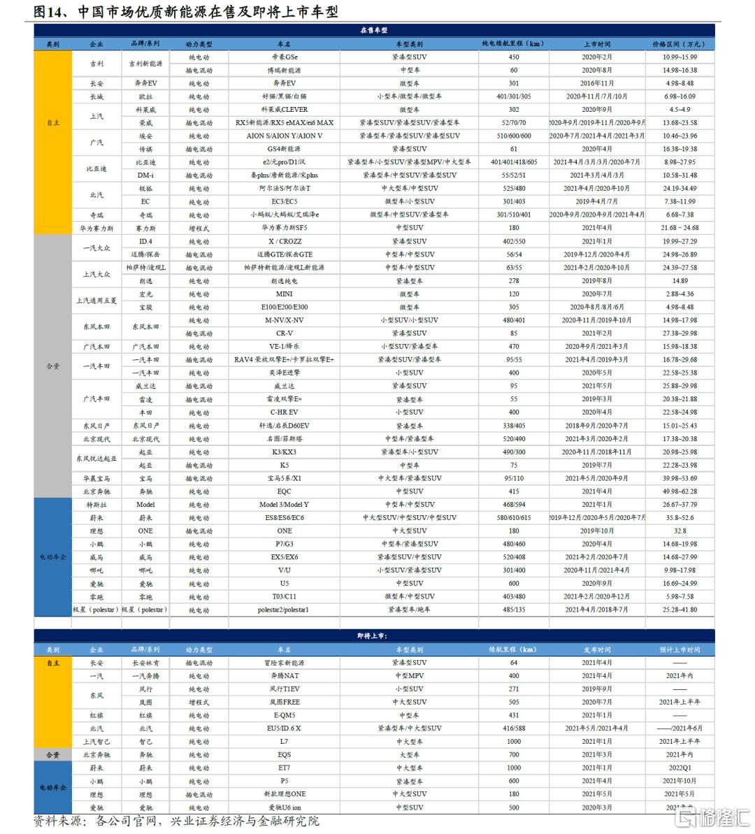 中国市场新能源汽车车型自2020下半年开始加速投放,多车型百花齐放迎接市场增长:2020下半年开始,多款优质新能源车上市热销。自主品牌方面,长城欧拉好猫、广汽Aion V、比亚迪汉/DM-i混动系列、奇瑞小蚂蚁等车型深受消费者喜爱。合资品牌方面,大众的MEB平台ID.4、宝马ix3、沃尔沃Polestar 2、别克的Velite 7、奔驰EQC等。造车新势力方面,较为关注的是蔚来EC6、特斯拉Model Y、小鹏P5等车型。展望2021/2022年,蔚来ET7、吉利极氪001、上汽智己、极弧阿尔法等车型上市将为新能源车市场注入更多活力。